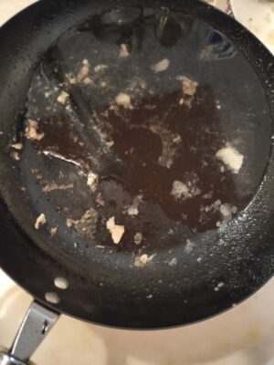 鉄のフライパンは油を引いてからしっかりと馴染ませないとくっつくとのことなので、時間をかけて油を高温にしました。